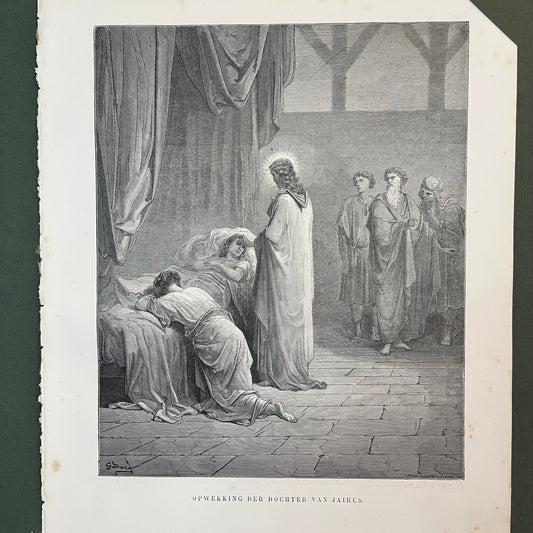 Opwekking der dochter van Jairus. Originele houtgravure van Gustave Doré uit 1875.