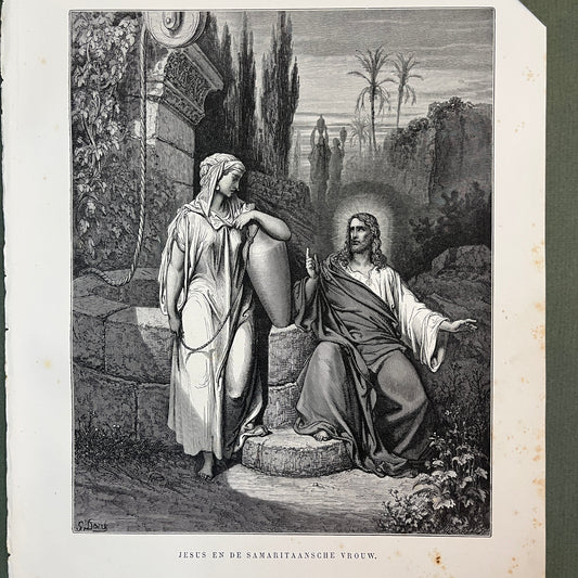 Jesus en de Samaritaansche vrouw. Originele houtgravure van Gustave Doré uit 1875.