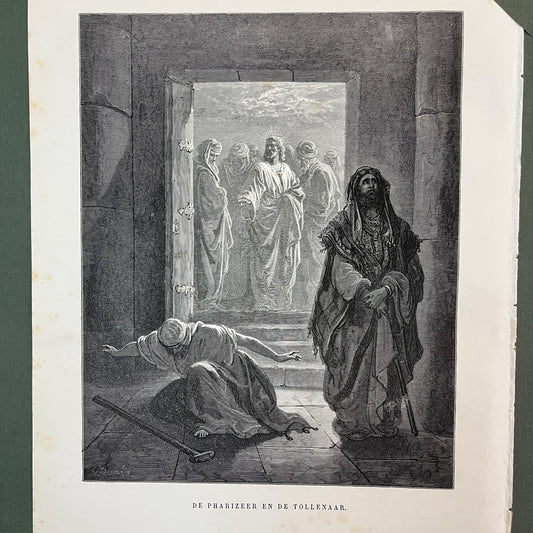 De pharizeer en de tollenaar. Originele houtgravure van Gustave Doré uit 1875.