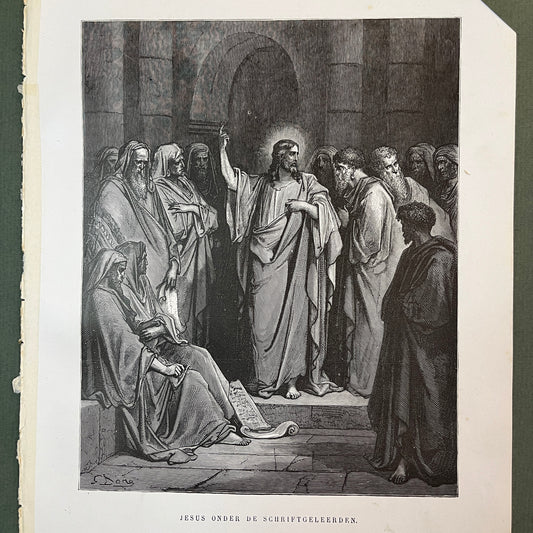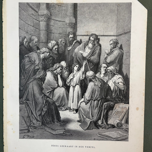 Jesus onder de schriftgeleerden. Originele houtgravure van Gustave Doré uit 1875.