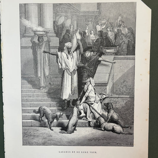 Lazarus en de rijke vrek. Originele houtgravure van Gustave Doré uit 1875.