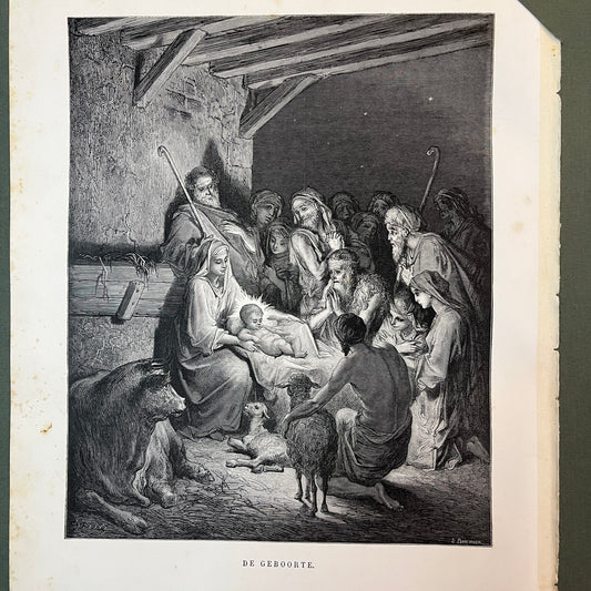 De geboorte. Originele houtgravure van Gustave Doré uit 1875.