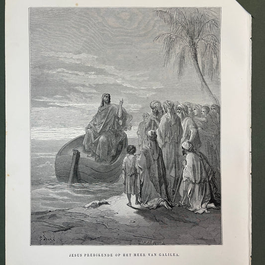 Jesus predikende op het meer van Galilea. Originele houtgravure van Gustave Doré uit 1875.