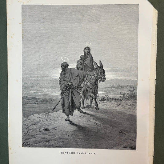 De vlucht naar Egypte. Originele houtgravure van Gustave Doré uit 1875.