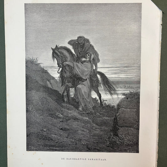 De barmhartige Samaritaan. Originele houtgravure van Gustave Doré uit 1875.
