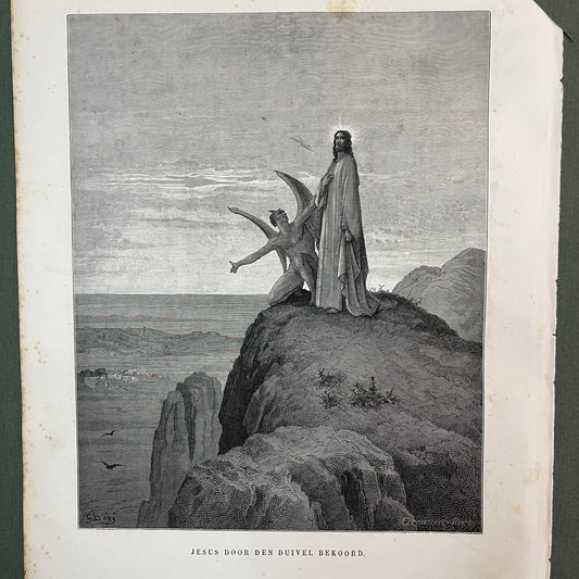 Jesus door den duivel bekoord. Originele houtgravure van Gustave Doré uit 1875.