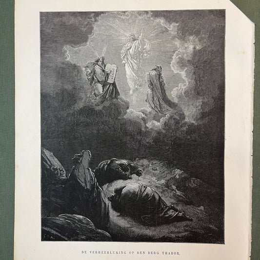 De verheerlijking op den berg Thabor. Originele houtgravure van Gustave Doré uit 1875.