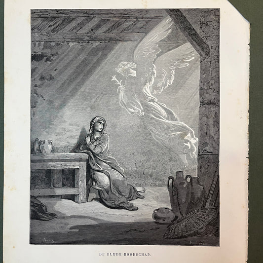 De blijde boodschap. Originele houtgravure van Gustave Doré uit 1875.