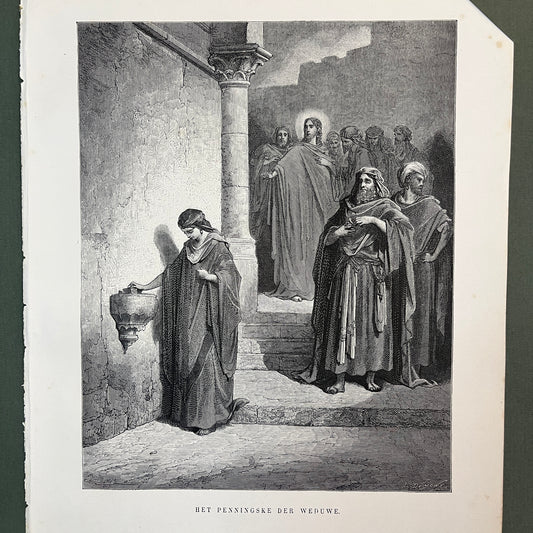 Het penningske der weduwe. Originele houtgravure van Gustave Doré uit 1875.