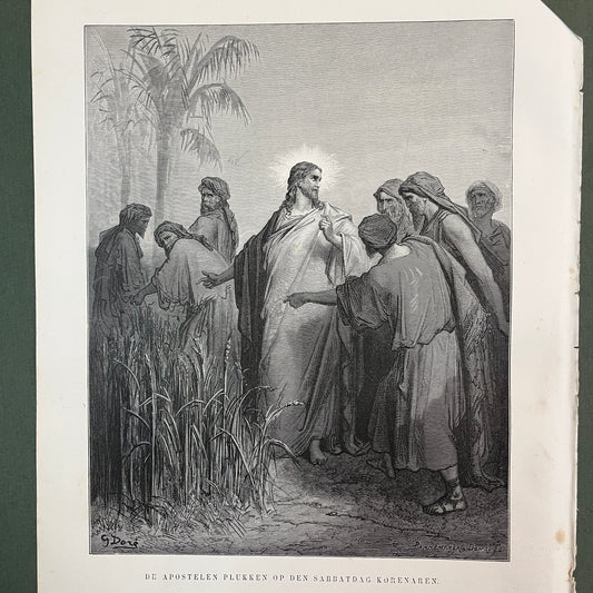 De apostelen plukken op den sabbatdag korenaren. Originele houtgravure van Gustave Doré uit 1875.