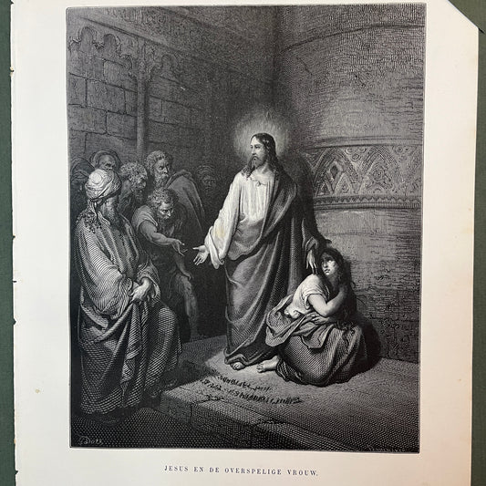 Jesus en de overspelige vrouw. Originele houtgravure van Gustave Doré uit 1875.