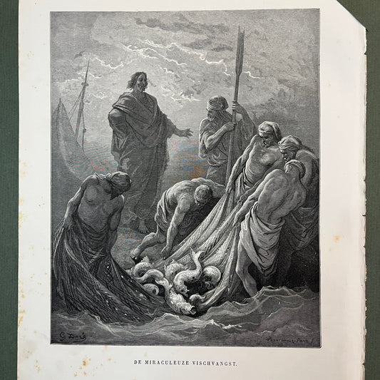 De miraculeuze vischvangst. Originele houtgravure van Gustave Doré uit 1875.