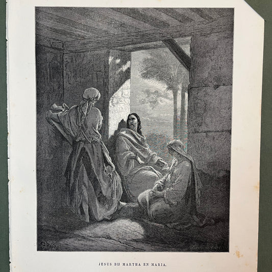 Jesus bij Martha en Maria. Originele houtgravure van Gustave Doré uit 1875.