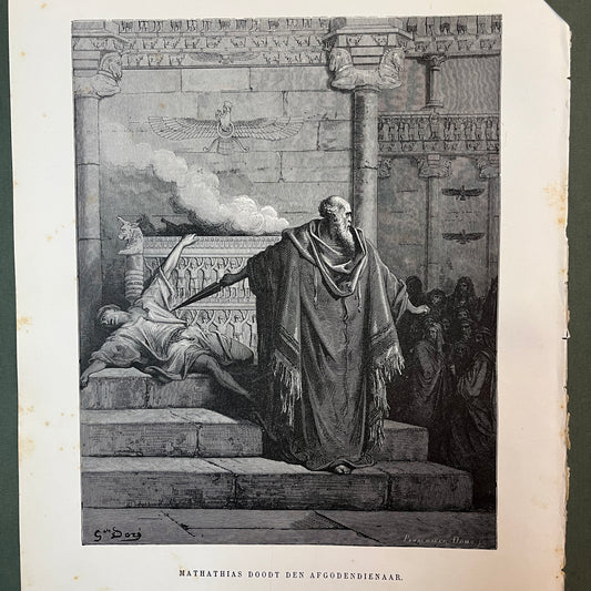 Mathathias doodt den afgodendienaar. Originele houtgravure van Gustave Doré uit 1875.