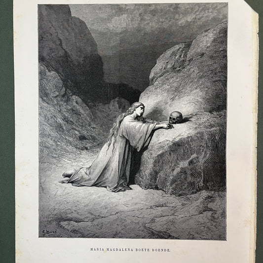 Maria Magdalena boete doende. Originele houtgravure van Gustave Doré uit 1875.