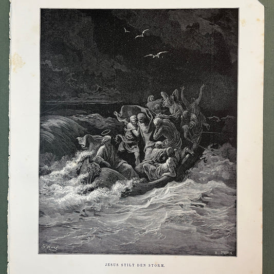 Jesus stilt den storm. Originele houtgravure van Gustave Doré uit 1875.