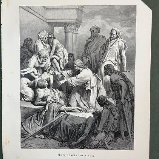 Jesus geneest de zieken. Originele houtgravure van Gustave Doré uit 1875.