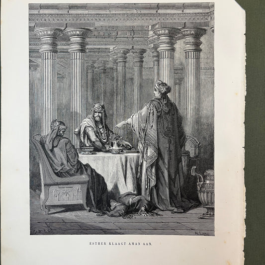 Esther klaagt Aman aan. Originele houtgravure van Gustave Doré uit 1875.