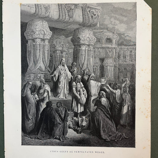 Cyrus geeft de tempelvaten weder. Originele houtgravure van Gustave Doré uit 1875.