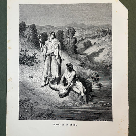 Tobias en de engel. Originele houtgravure van Gustave Doré uit 1875.