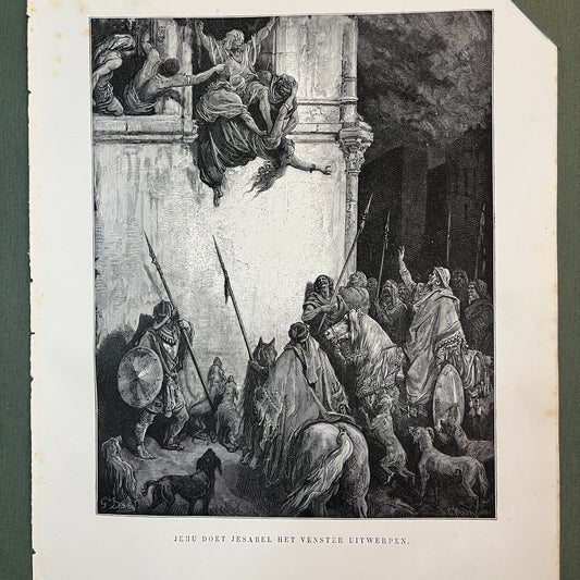 Jehu doet Jesabel het venster uitwerpen. Originele houtgravure van Gustave Doré uit 1875.