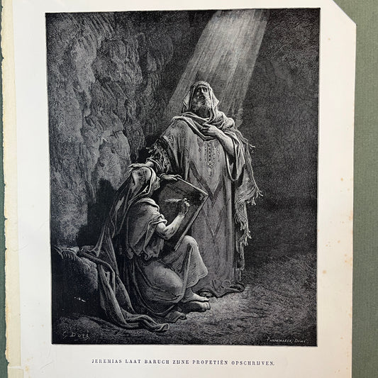 Jeremias laat Baruch zijne profetiën opschrijven. Originele houtgravure van Gustave Doré uit 1875.