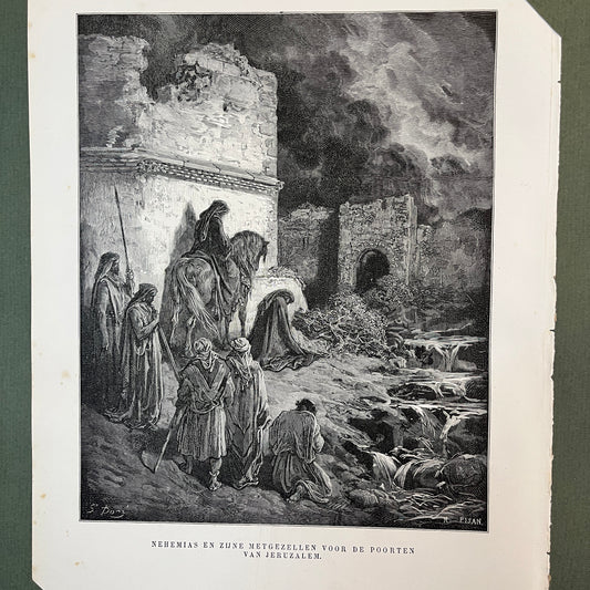 Nehemias en zijne metgezellen voor de poorten van Jeruzalem. Originele houtgravure van Gustave Doré uit 1875.