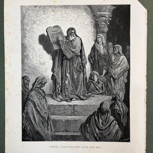 Esdras vertoont het boek der wet. Originele houtgravure van Gustave Doré uit 1875.