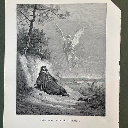 Elias door een engel gespijzigd. Originele houtgravure van Gustave Doré uit 1875.