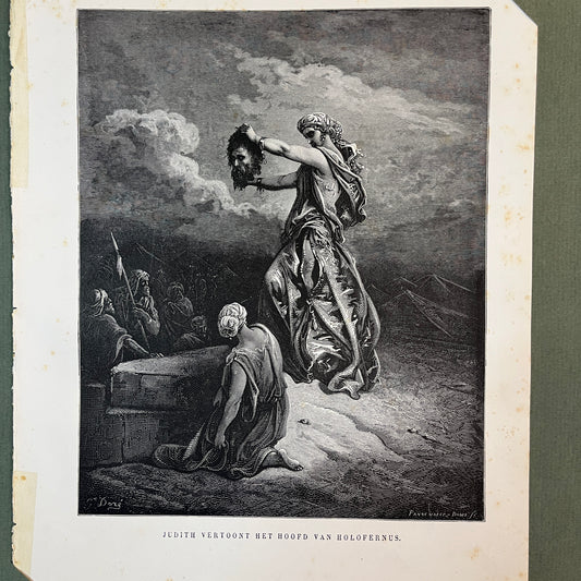Judith vertoont het hoofd van Holofernus. Originele houtgravure van Gustave Doré uit 1875.