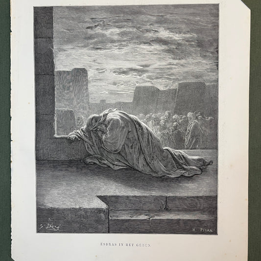 Esdras in het gebed. Originele houtgravure van Gustave Doré uit 1875.