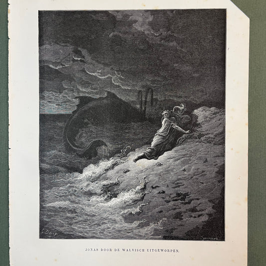 Jonas door de walvisch uitgeworpen. Originele houtgravure van Gustave Doré uit 1875.