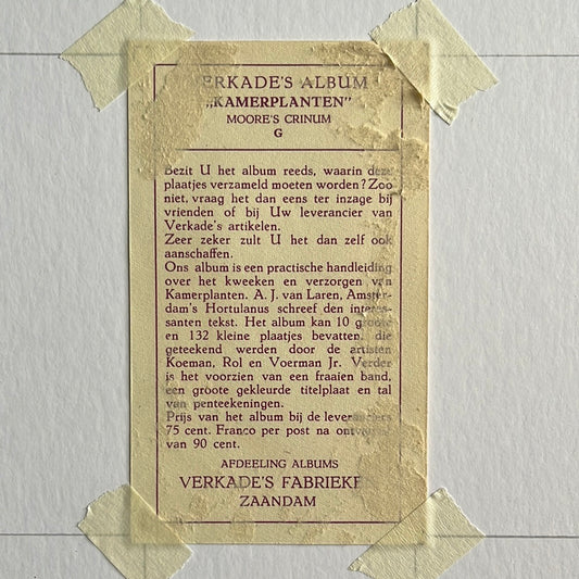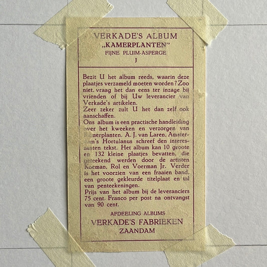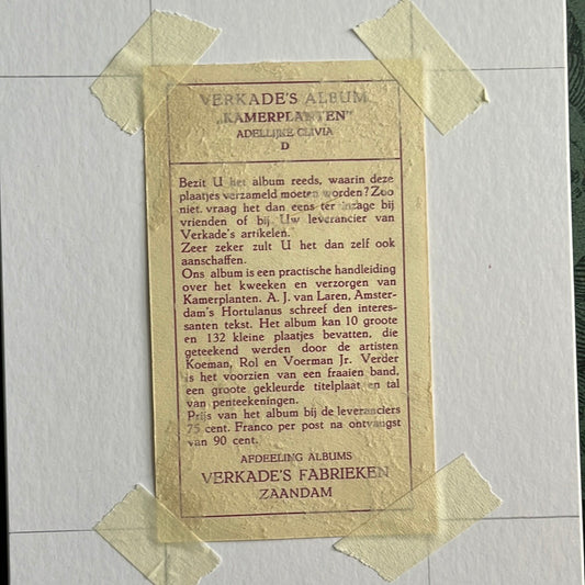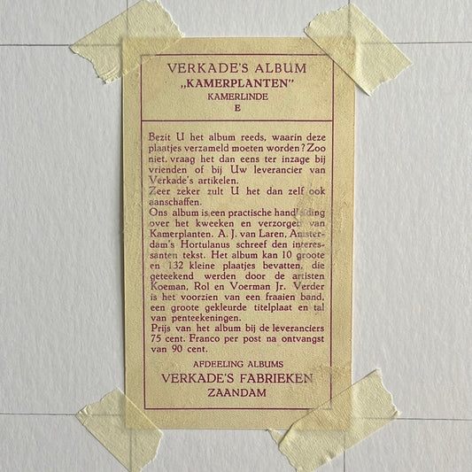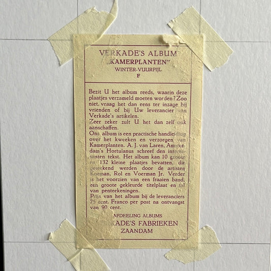 Deze plaatjes komen uit het album 'Kamerplanten' van Verkade uit 1928. In totaal zaten er 132 kleine plaatjes, 10 middelgrote en 1 grote plaat in het album.