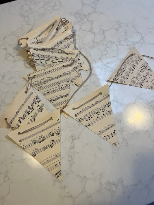 Ik houd er van om oude gebruikte items te restylen tot nieuwe items. Eén zo'n voorbeeld is vlaggetjeslijnen. Ik maak ze van oude stoffen, vintage bladmuziek, vintage boeken of oude atlaskaarten. Het assortiment breid ik telkens uit.