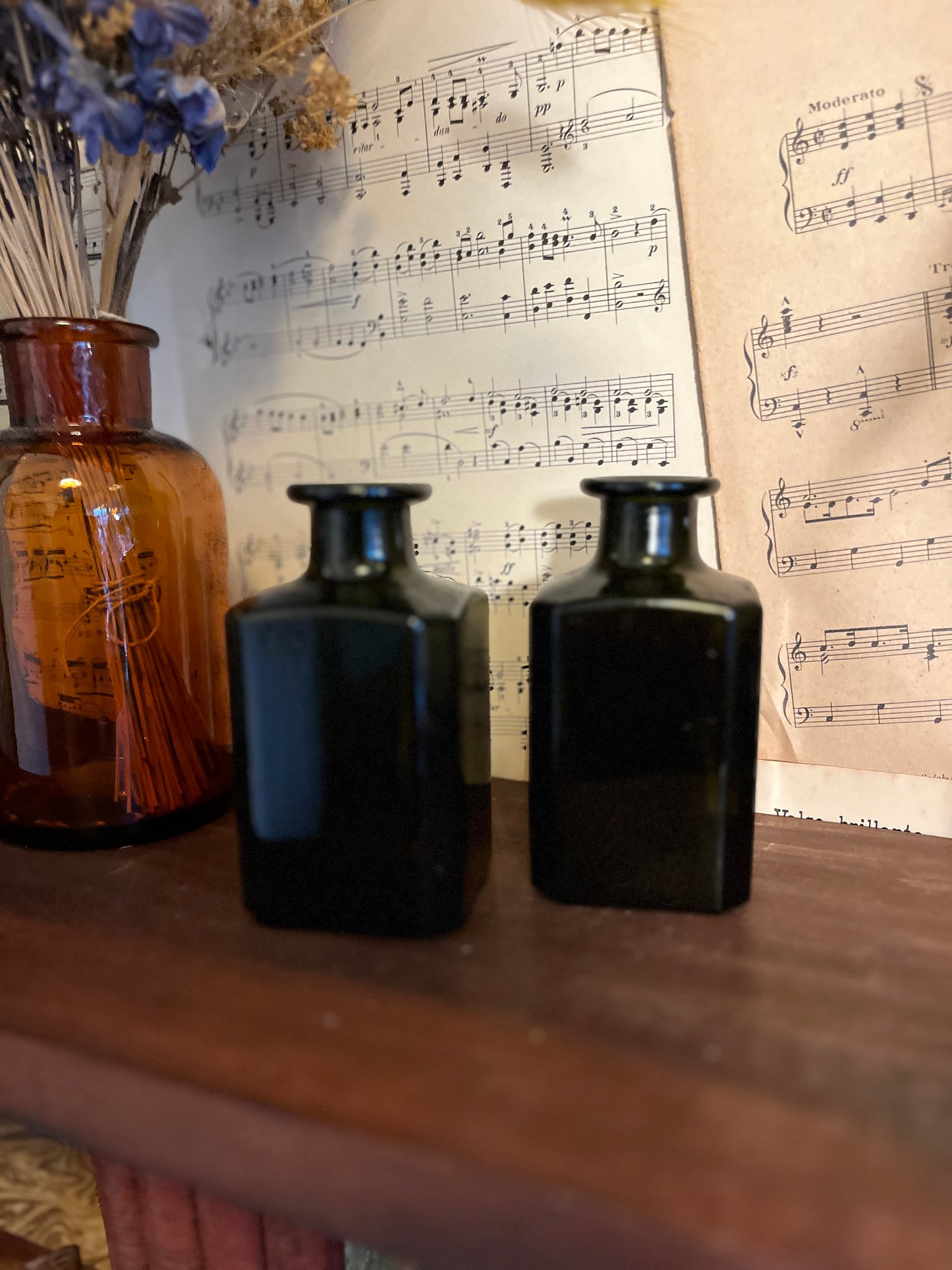 Set aus zwei süßen Vasen aus dunklem Glas. Die polierten Ecken sind lustig und dekorativ. Abmessungen: 6,5 x 6,5 x 12 cm.