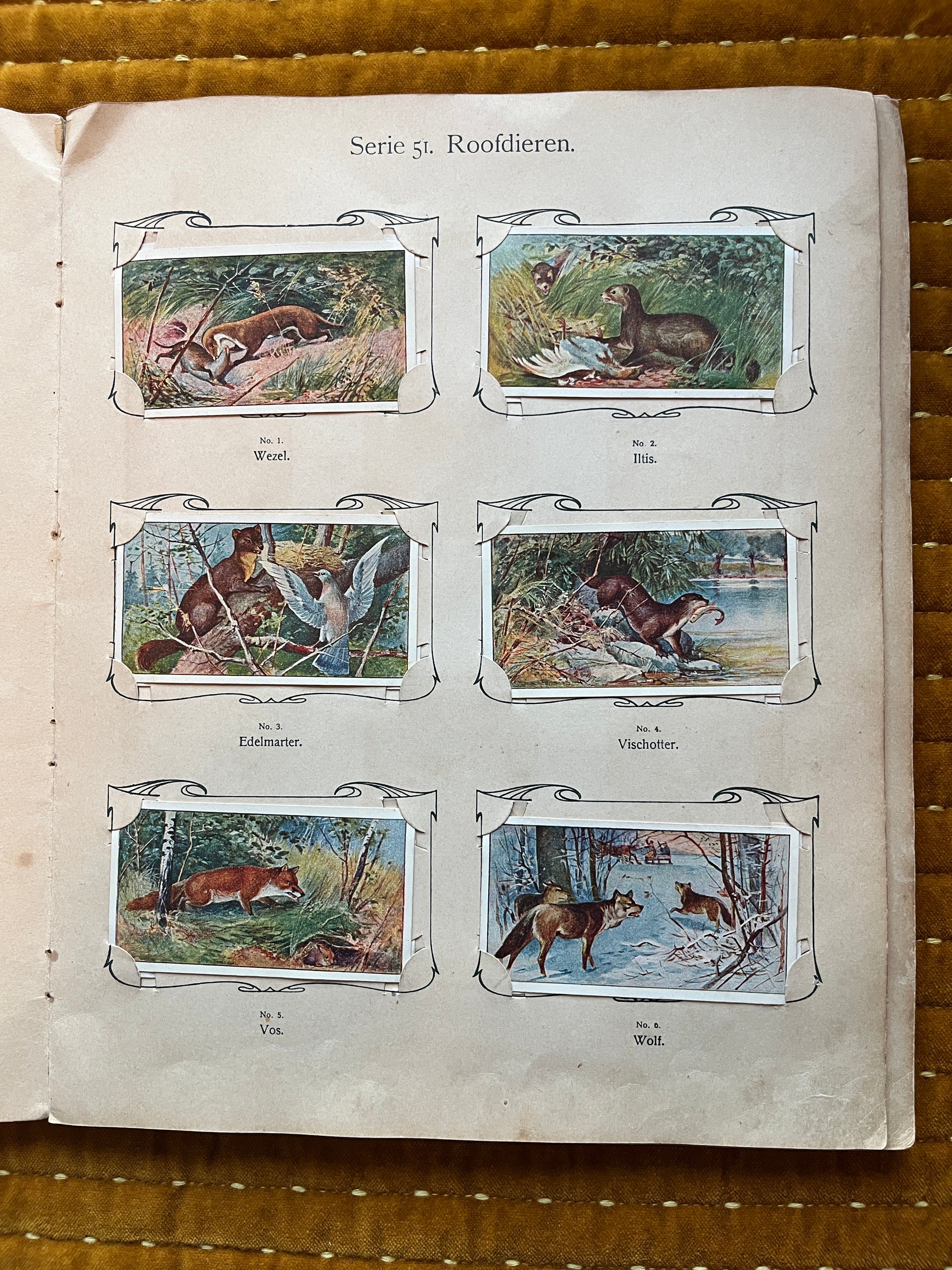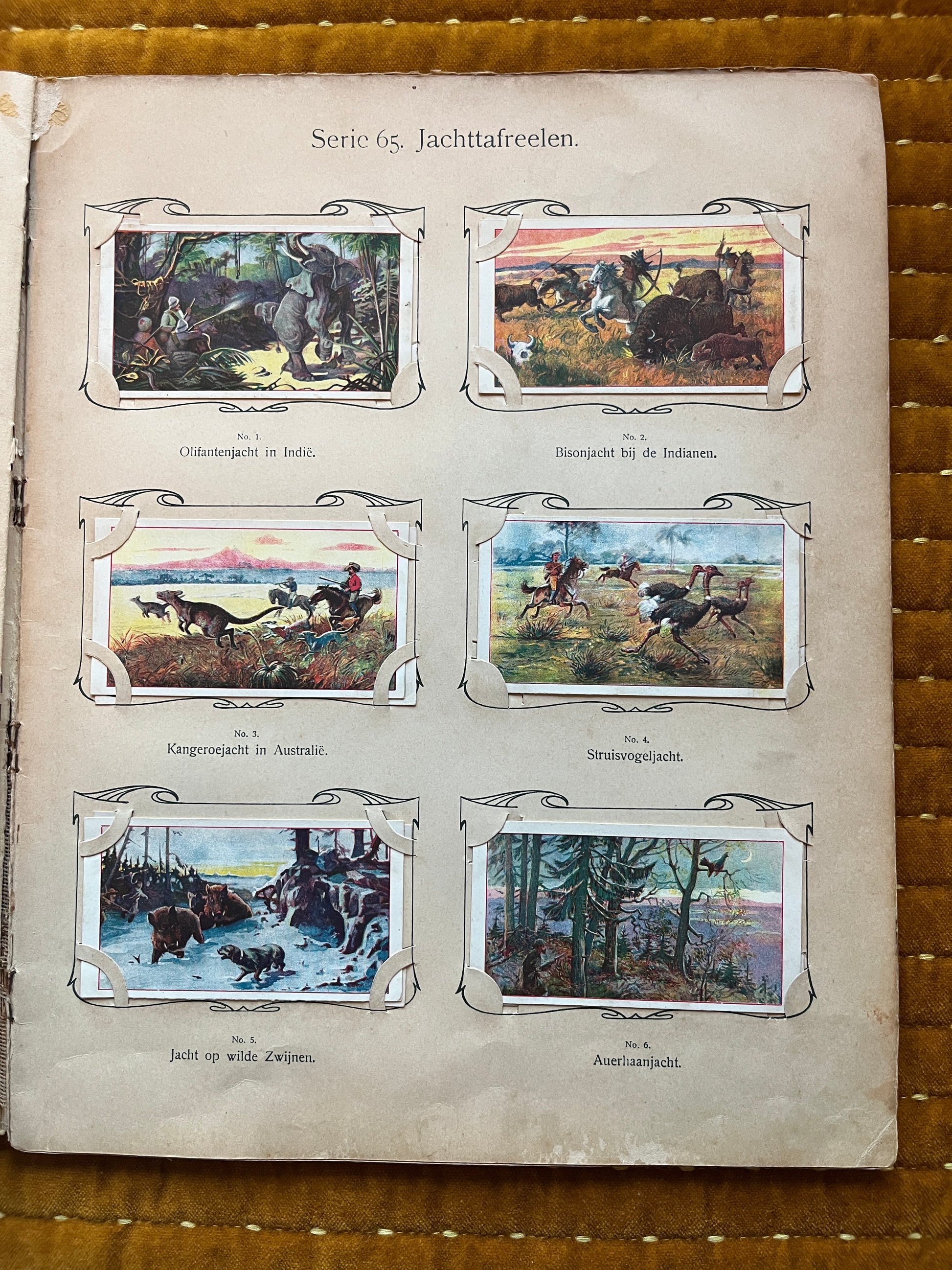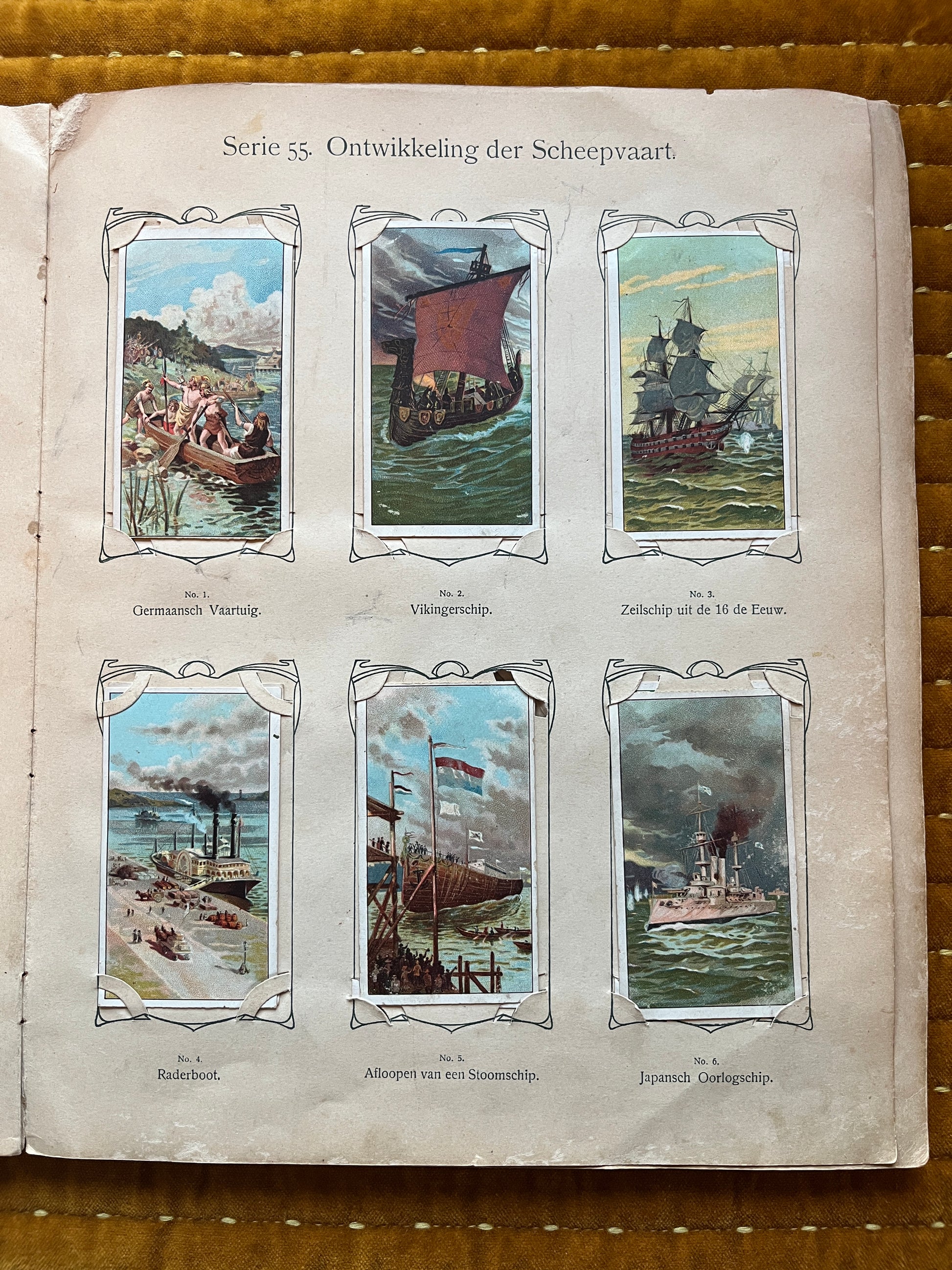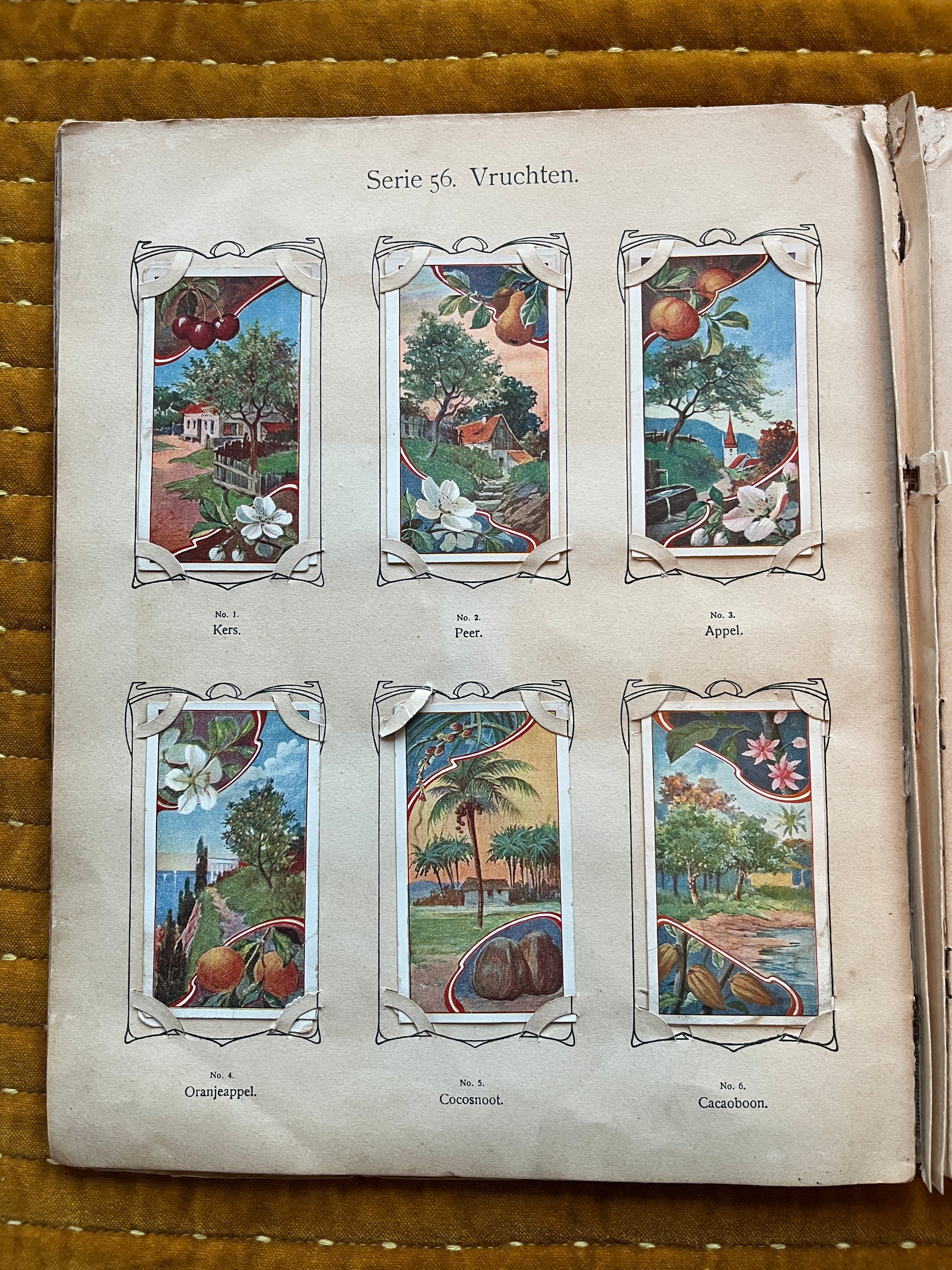 Given its age and the fact that the first three Verkade albums were made of relatively low-quality paper, the album has some damage, as can be seen in the photos. All pages are still in the album and are not completely detached. The side cover is still legible, with some minor damage in the corners.