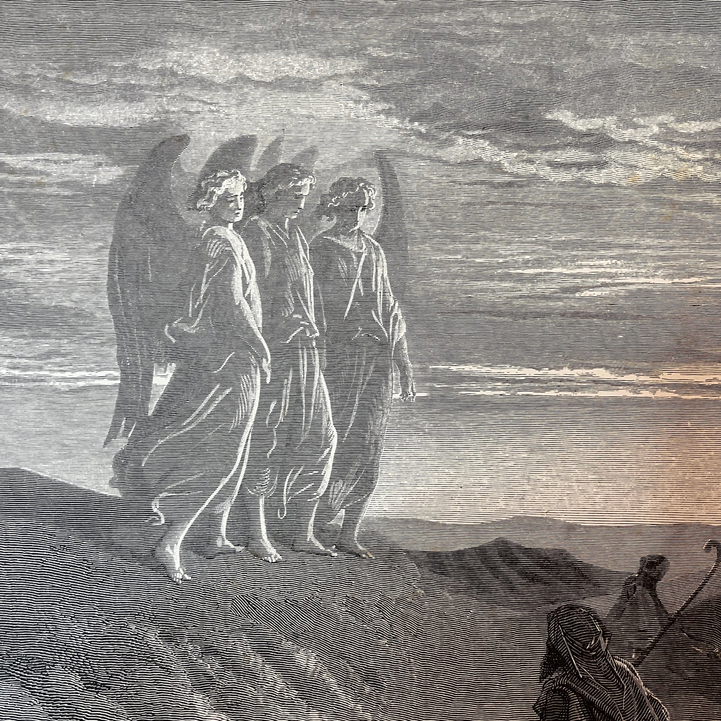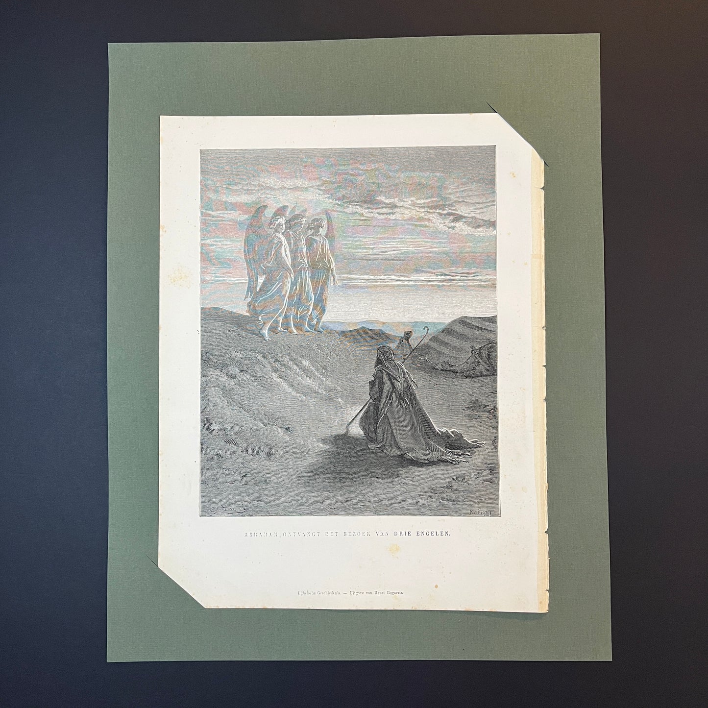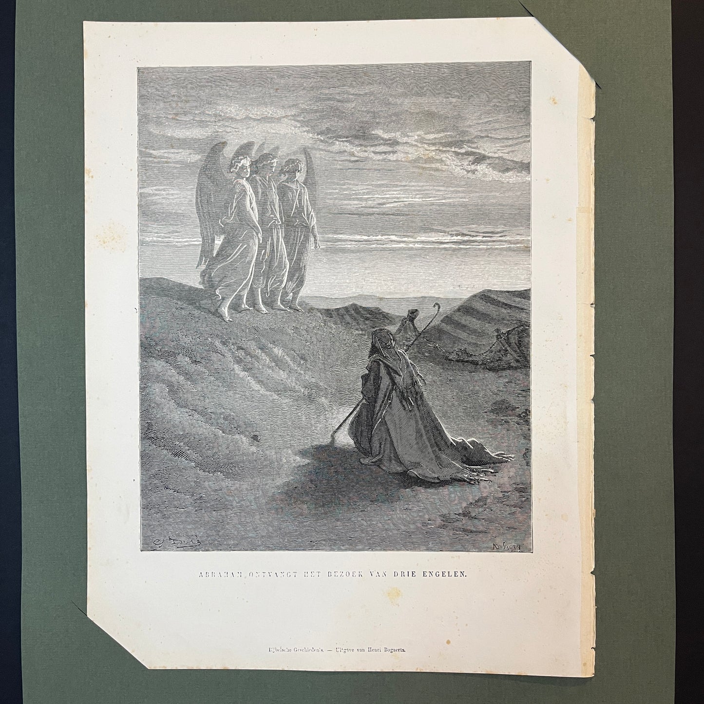 Abraham ontvangt het bezoek van drie engelen. Originele houtgravure van Gustave Doré uit 1875.