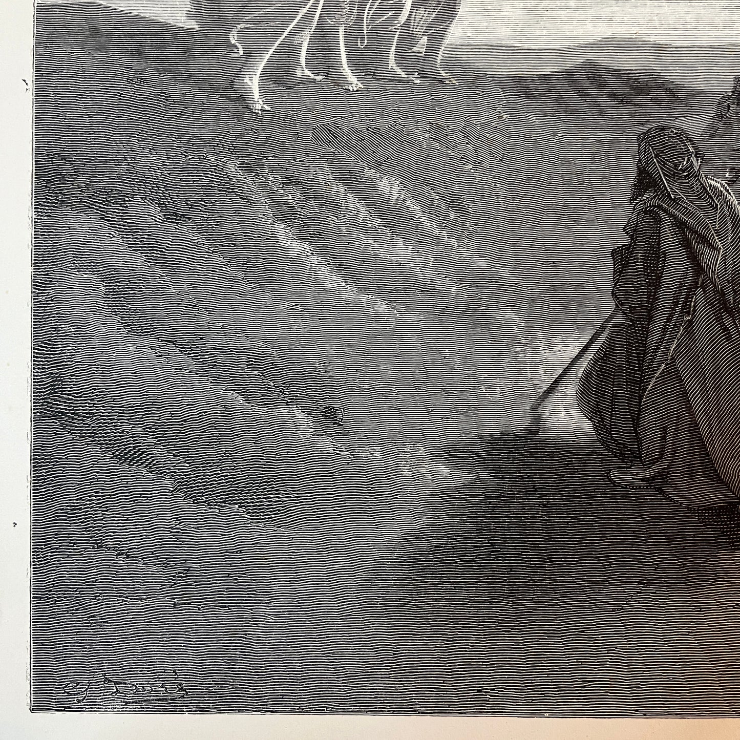 Dit is een originele houtgravure getekend en ontworpen door Gustave Doré en gegraveerd door Ad Ligny. De gravure komt uit 1875 en was onderdeel van een statige Bijbel 'De Bijbelsche Geschiedenis' voor het Katholieke Nederlandsche Volk. De Bijbel is gedrukt door Henri Bogaerts (opvolger van P.N. Verhoeven), drukker en boekhandelaar van Zijn Heiligheid Paus Pius IX. De pagina heeft een afmeting van 25x32,5 cm. Je kunt ervoor kiezen om de gravure los te bestellen of in een witte of zwarte passe-partout. Beide passe-partouts hebben een witte binnenrand en hebben de afmeting 30x35 cm.