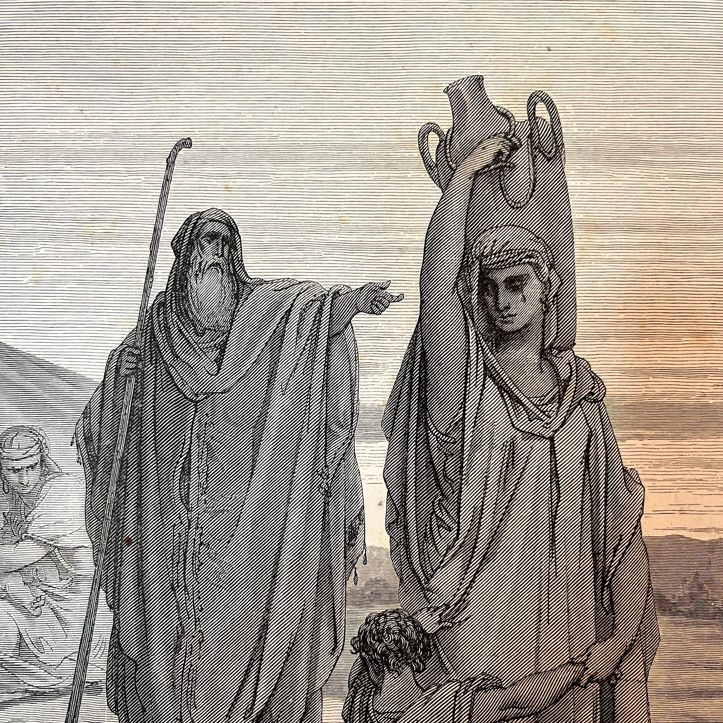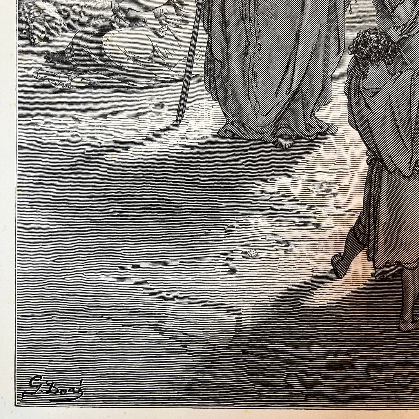 Dit is een originele houtgravure getekend en ontworpen door Gustave Doré. De gravure komt uit 1875 en was onderdeel van een statige Bijbel 'De Bijbelsche Geschiedenis' voor het Katholieke Nederlandsche Volk. De Bijbel is gedrukt door Henri Bogaerts (opvolger van P.N. Verhoeven), drukker en boekhandelaar van Zijn Heiligheid Paus Pius IX. De pagina heeft een afmeting van 25x32,5 cm. Je kunt ervoor kiezen om de gravure los te bestellen of in een witte of zwarte passe-partout. Beide passe-partouts hebben een witte binnenrand en hebben de afmeting 30x35 cm.