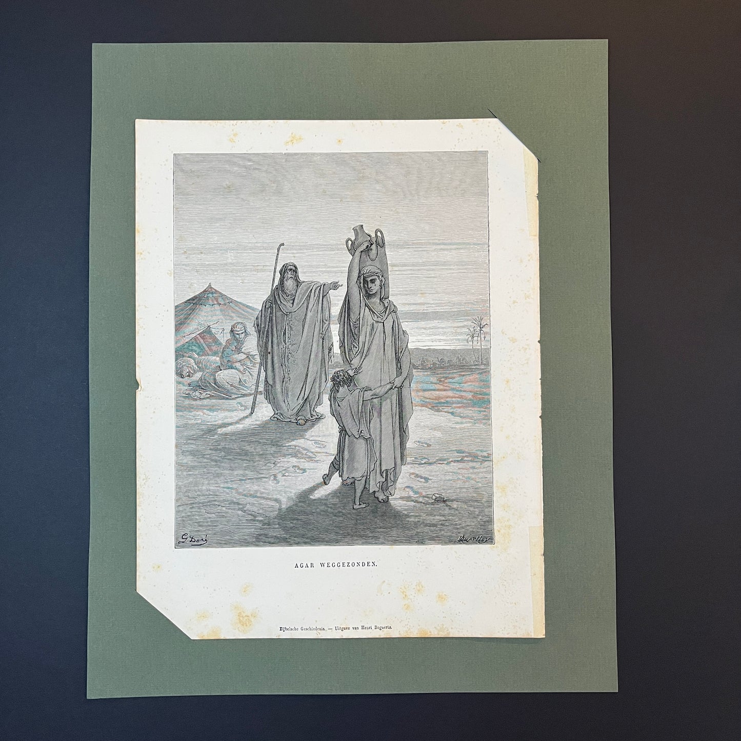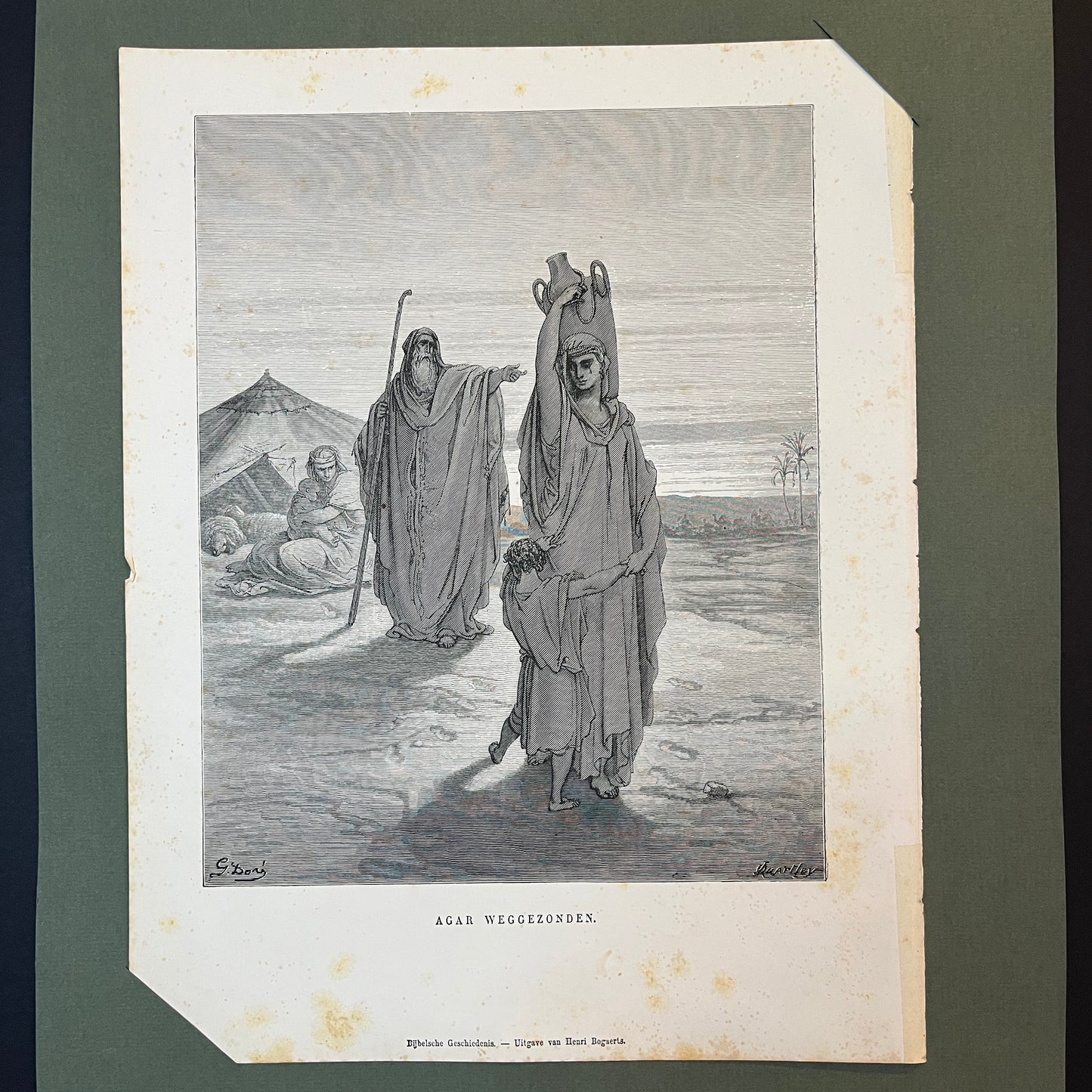 Agar weggezonden. Originele houtgravure van Gustave Doré uit 1875.