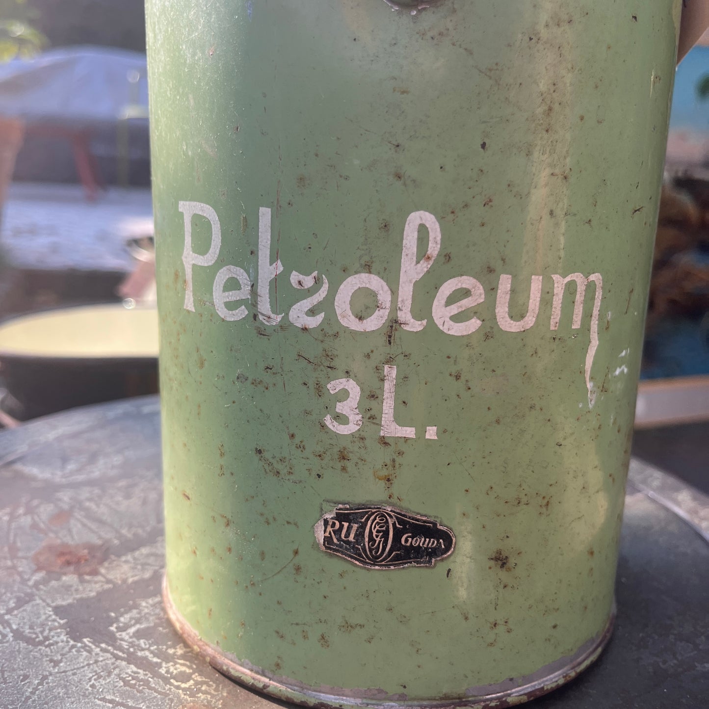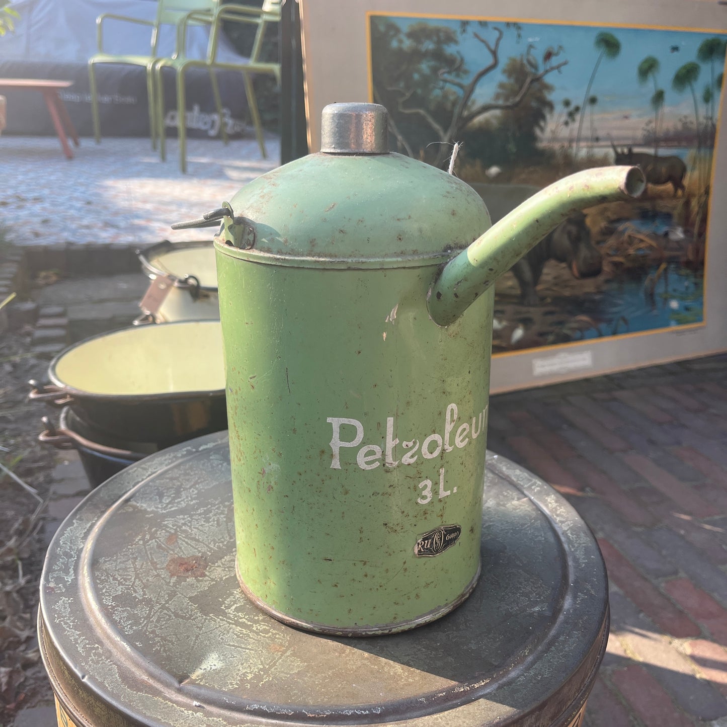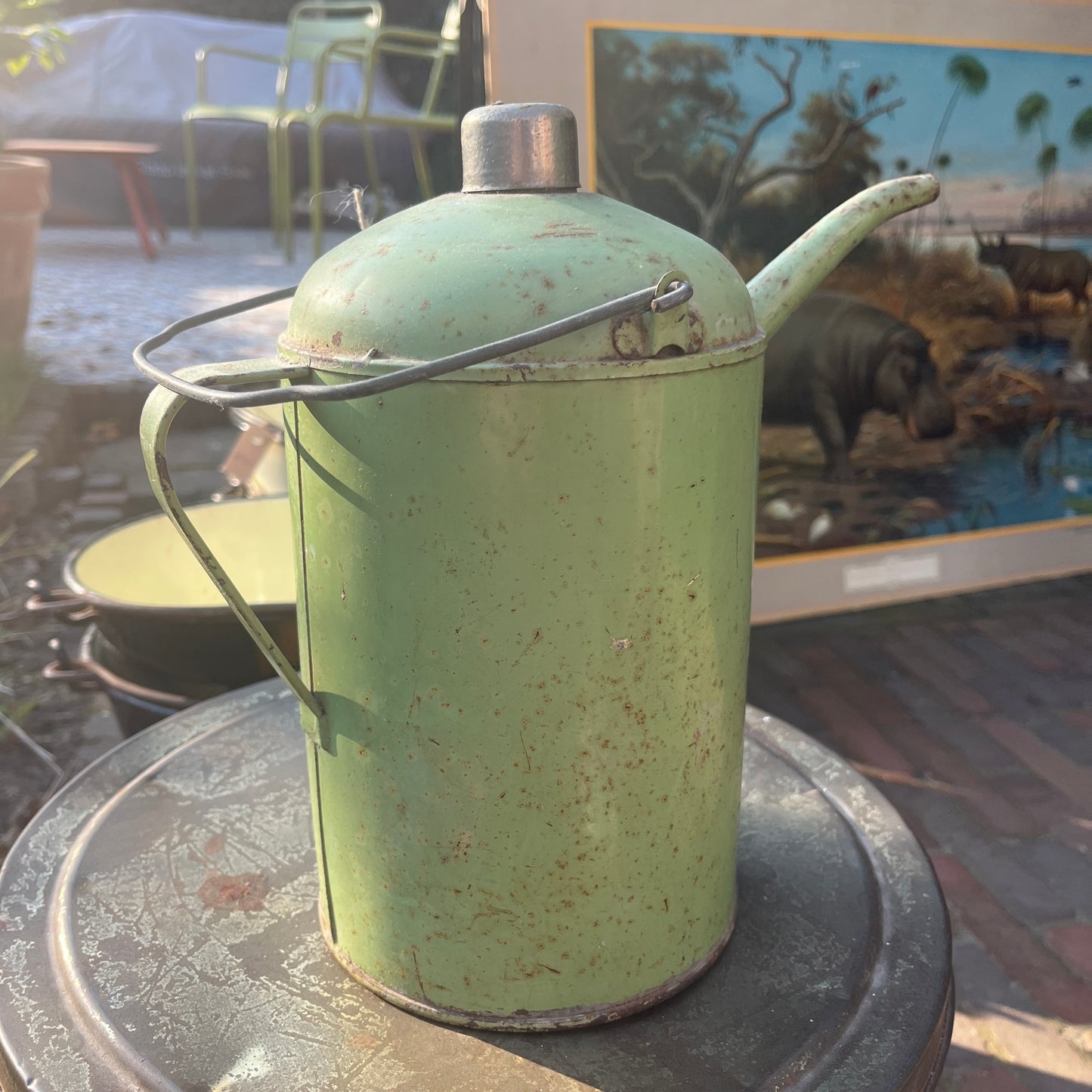Een schitterende oude petroleumkan van emaille in groene kleur.