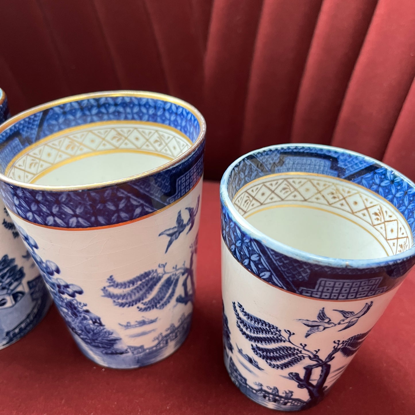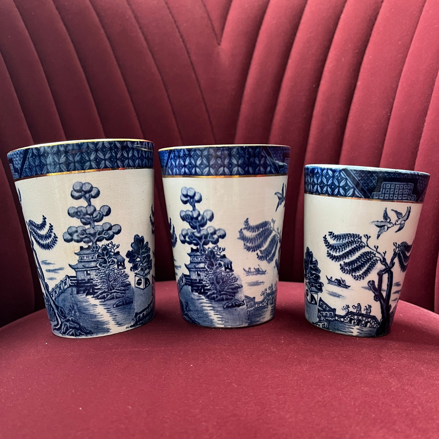 Deze unieke objecten komen alle drie uit de productieperiode 1921-1944. De middelste beker heeft een volledig gouden rand.