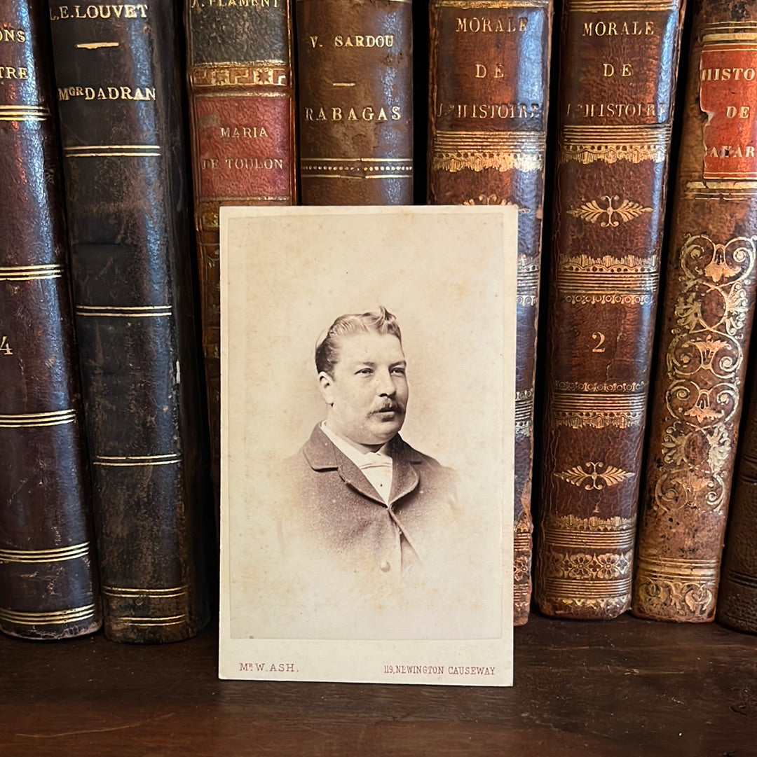 Prachtige antieke carte de visite uit de periode 1850-1914. Deze fotokaarten op karton waren heel geliefd halverwege de 19e eeuw tot aan de Eerste Wereldoorlog. De kartonnen kaarten zijn meestal 6,5x10 cm met op de voorkant de albuminen foto en de naam naam van de fotograaf en op de achterkant het logo van de fotograaf. Naar mate de jaren werden deze logo's met prachtige Victoriaanse tekens versierd en werden het een soort reclames. Deze carte de visite werden gegeven aan vrienden en familie en vaak verzameld in albums of neergezet in de boekenkast. Ook werden foto's van de koninklijke familie verzameld. Tegenwoordig zijn ze enorm geliefd vanwege de vintage uitstraling en de prachtige Victoriaanse achterkant. Omdat er bijna nooit een jaartal op werd gezet is het moeilijk te achterhalen uit welk jaartal de carte de visite komt.