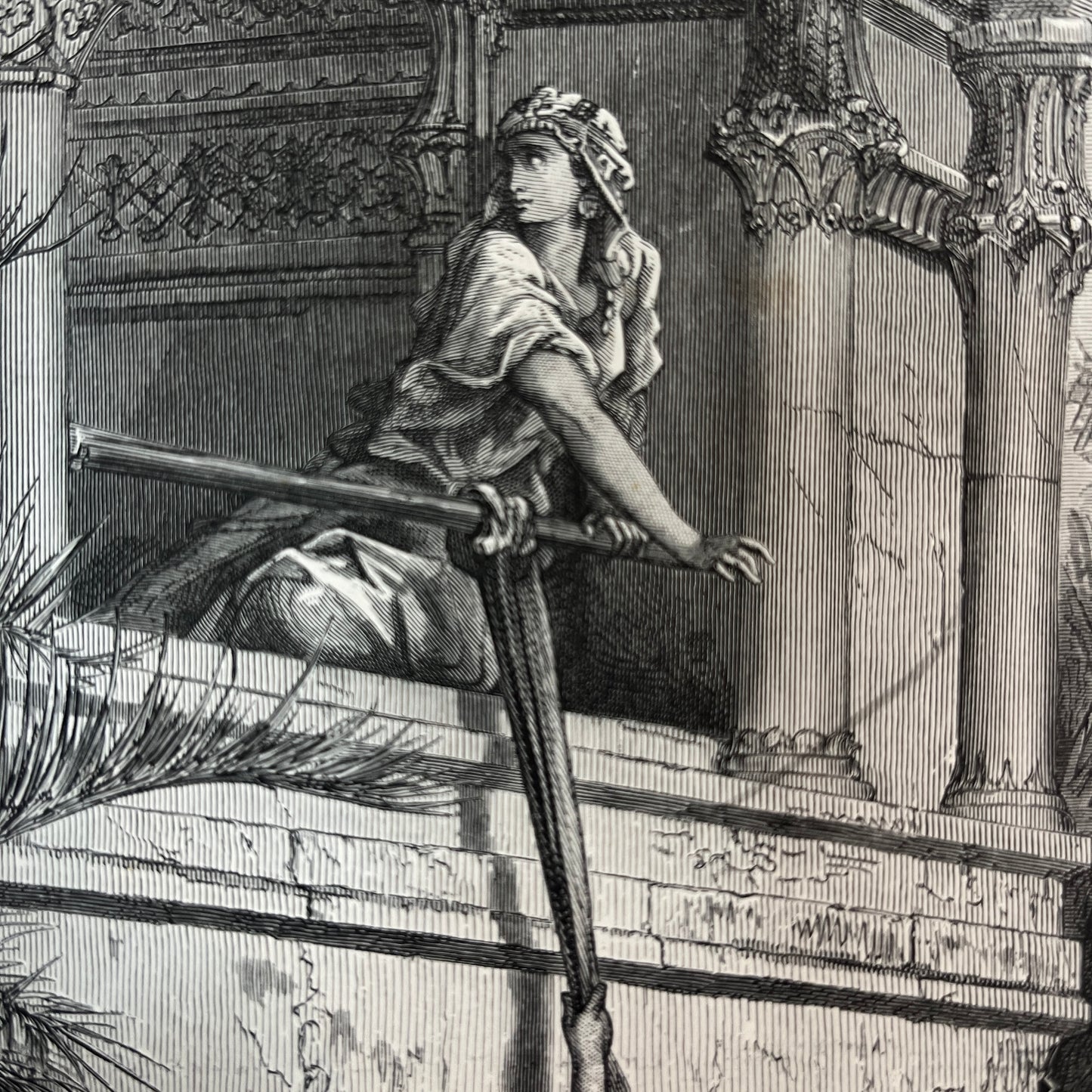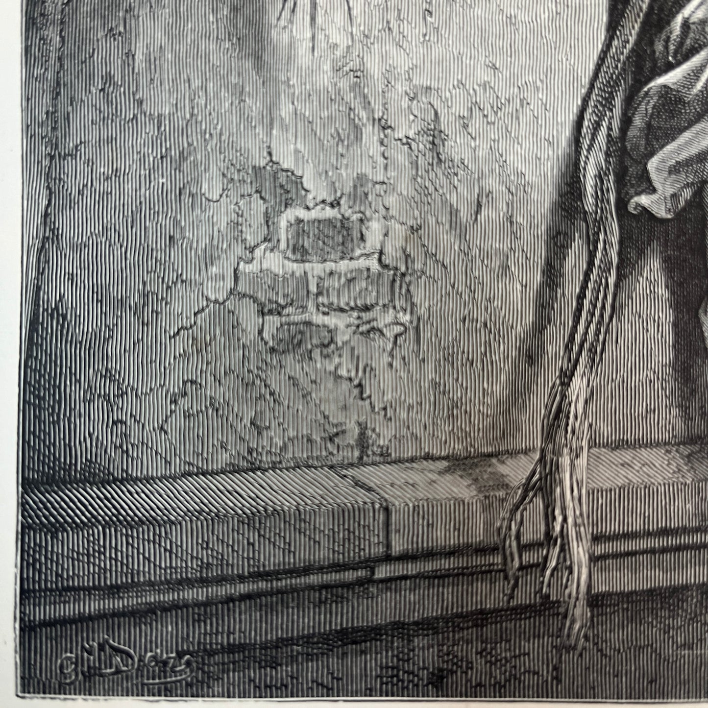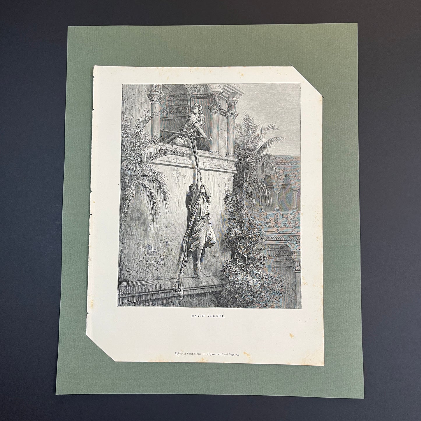 Dit is een originele houtgravure getekend en ontworpen door Gustave Doré. De gravure komt uit 1875 en was onderdeel van een statige Bijbel 'De Bijbelsche Geschiedenis' voor het Katholieke Nederlandsche Volk. De Bijbel is gedrukt door Henri Bogaerts (opvolger van P.N. Verhoeven), drukker en boekhandelaar van Zijn Heiligheid Paus Pius IX. De pagina heeft een afmeting van 25x32,5 cm. Je kunt ervoor kiezen om de gravure los te bestellen of in een witte of zwarte passe-partout. Beide passe-partouts hebben een witte binnenrand en hebben de afmeting 30x35 cm.