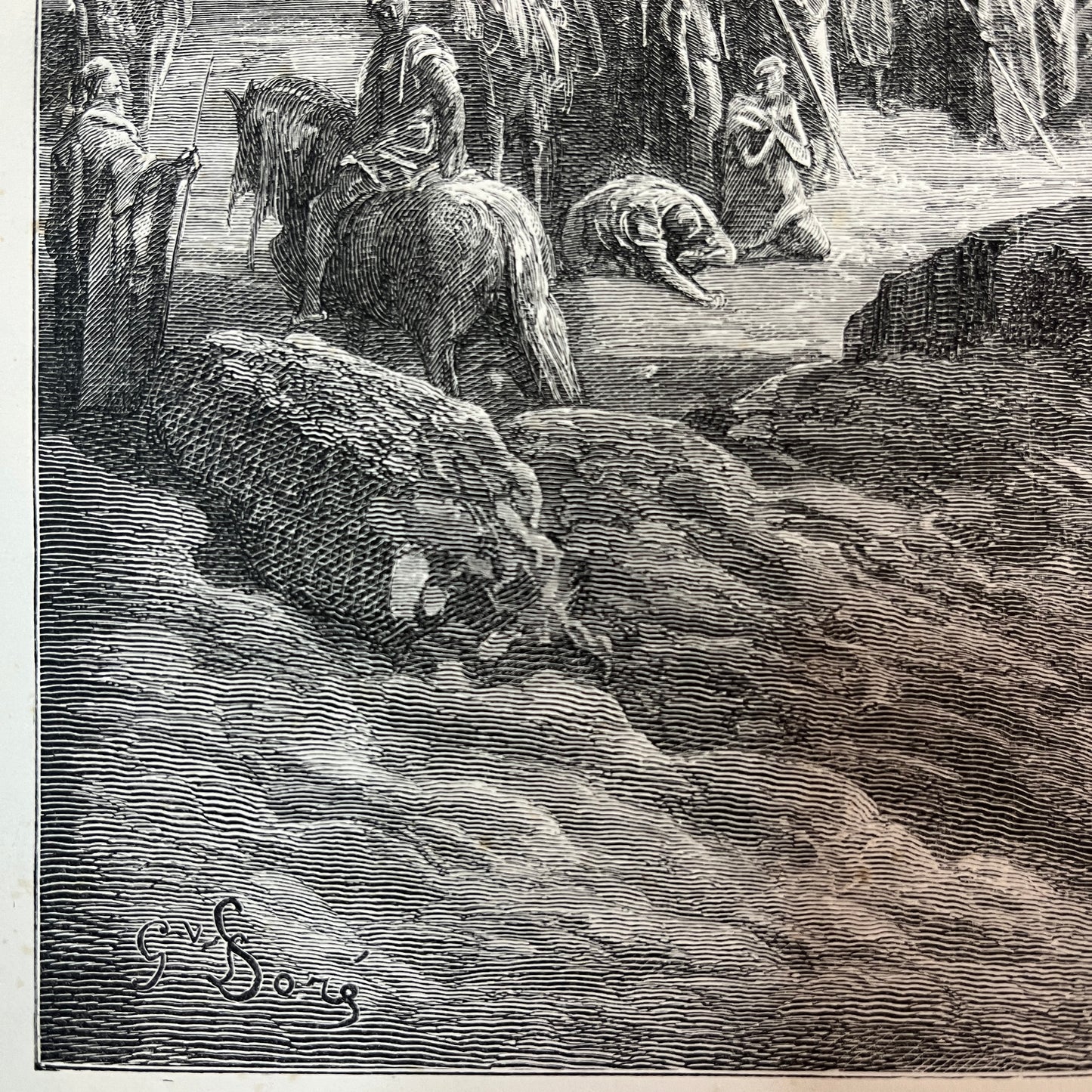 Dit is een originele houtgravure getekend en ontworpen door Gustave Doré en gegraveerd door C. Laplante. De gravure komt uit 1875 en was onderdeel van een statige Bijbel 'De Bijbelsche Geschiedenis' voor het Katholieke Nederlandsche Volk. De Bijbel is gedrukt door Henri Bogaerts (opvolger van P.N. Verhoeven), drukker en boekhandelaar van Zijn Heiligheid Paus Pius IX. De pagina heeft een afmeting van 25x32,5 cm. Je kunt ervoor kiezen om de gravure los te bestellen of in een witte of zwarte passe-partout. Beide passe-partouts hebben een witte binnenrand en hebben de afmeting 30x35 cm.