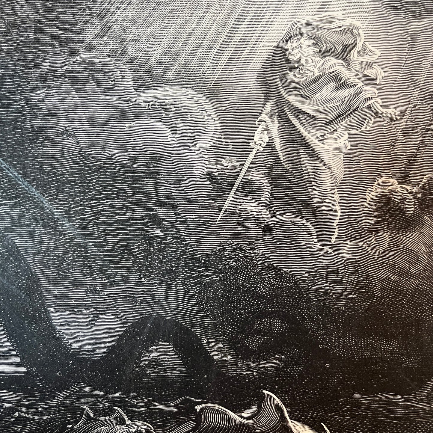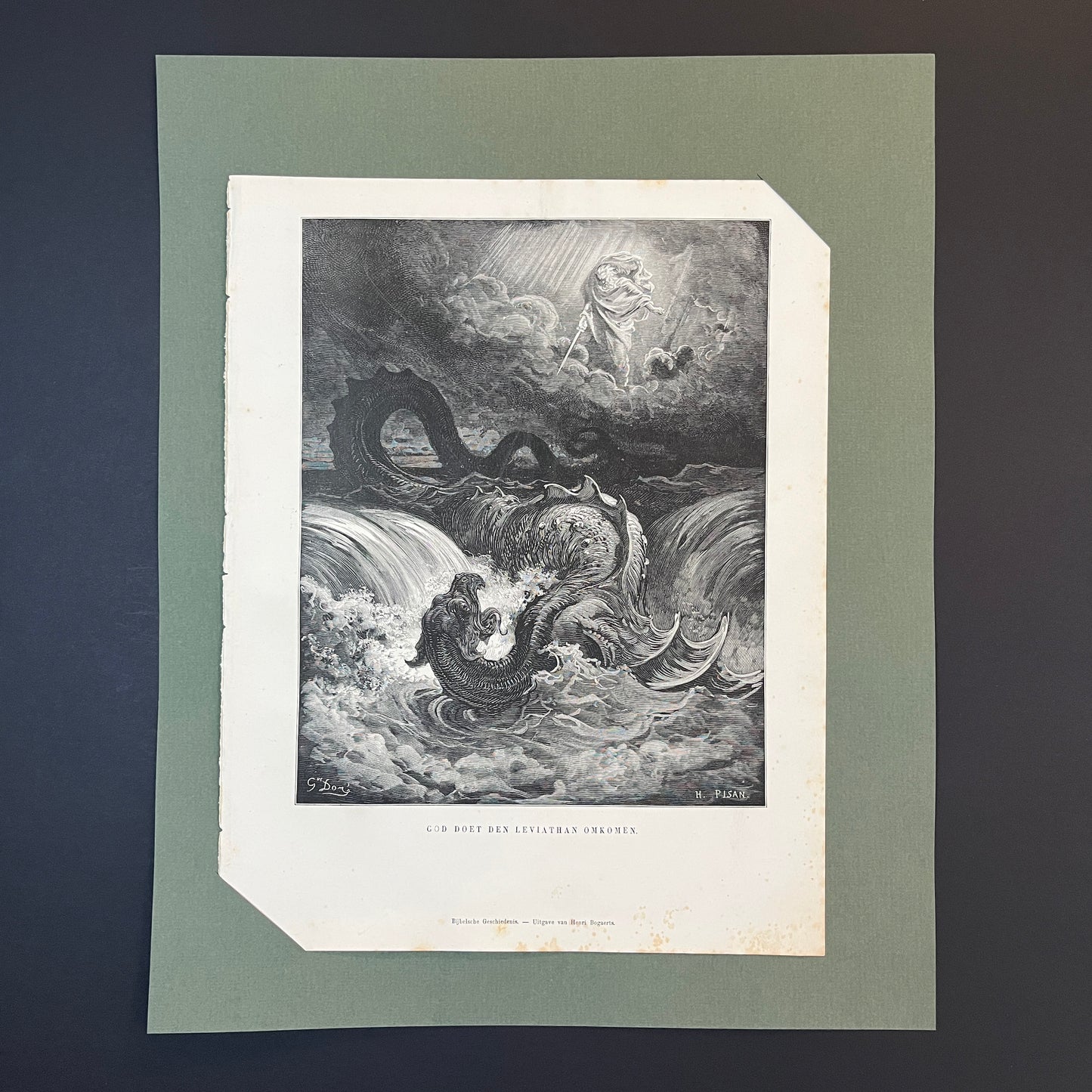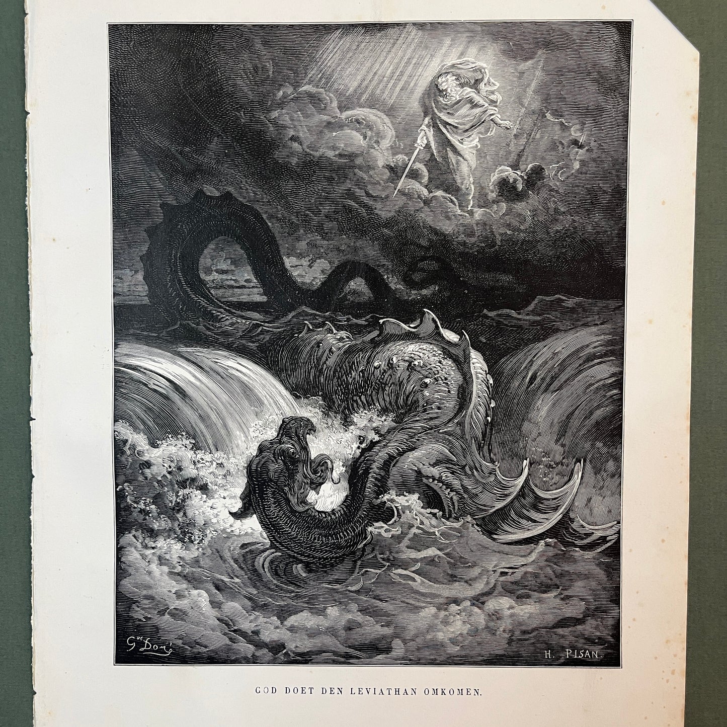 God doet den Leviathan omkomen. Originele houtgravure van Gustave Doré uit 1875.