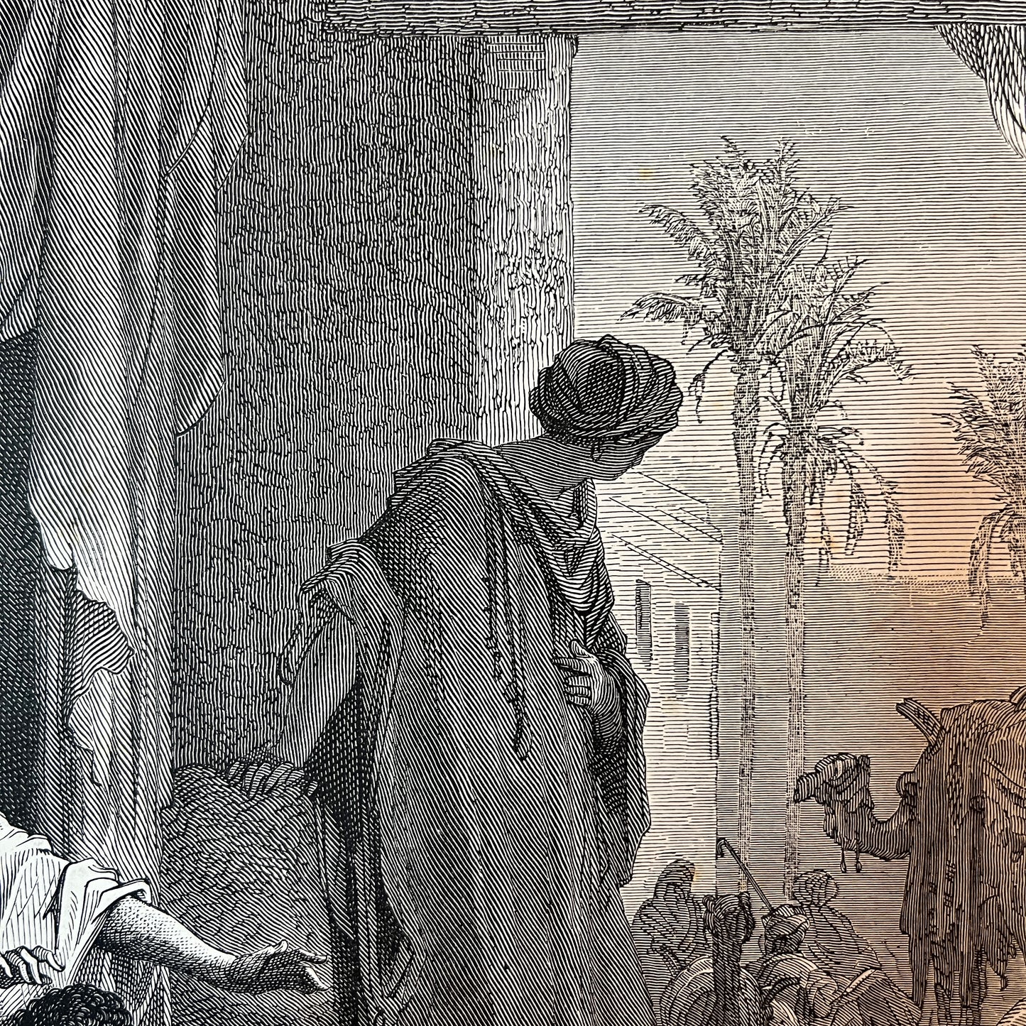Dit is een originele houtgravure getekend en ontworpen door Gustave Doré en gegraveerd door A. Bertrand. De gravure komt uit 1875 en was onderdeel van een statige Bijbel 'De Bijbelsche Geschiedenis' voor het Katholieke Nederlandsche Volk. De Bijbel is gedrukt door Henri Bogaerts (opvolger van P.N. Verhoeven), drukker en boekhandelaar van Zijn Heiligheid Paus Pius IX. De pagina heeft een afmeting van 25x32,5 cm. Je kunt ervoor kiezen om de gravure los te bestellen of in een witte of zwarte passe-partout. Beide passe-partouts hebben een witte binnenrand en hebben de afmeting 30x35 cm.