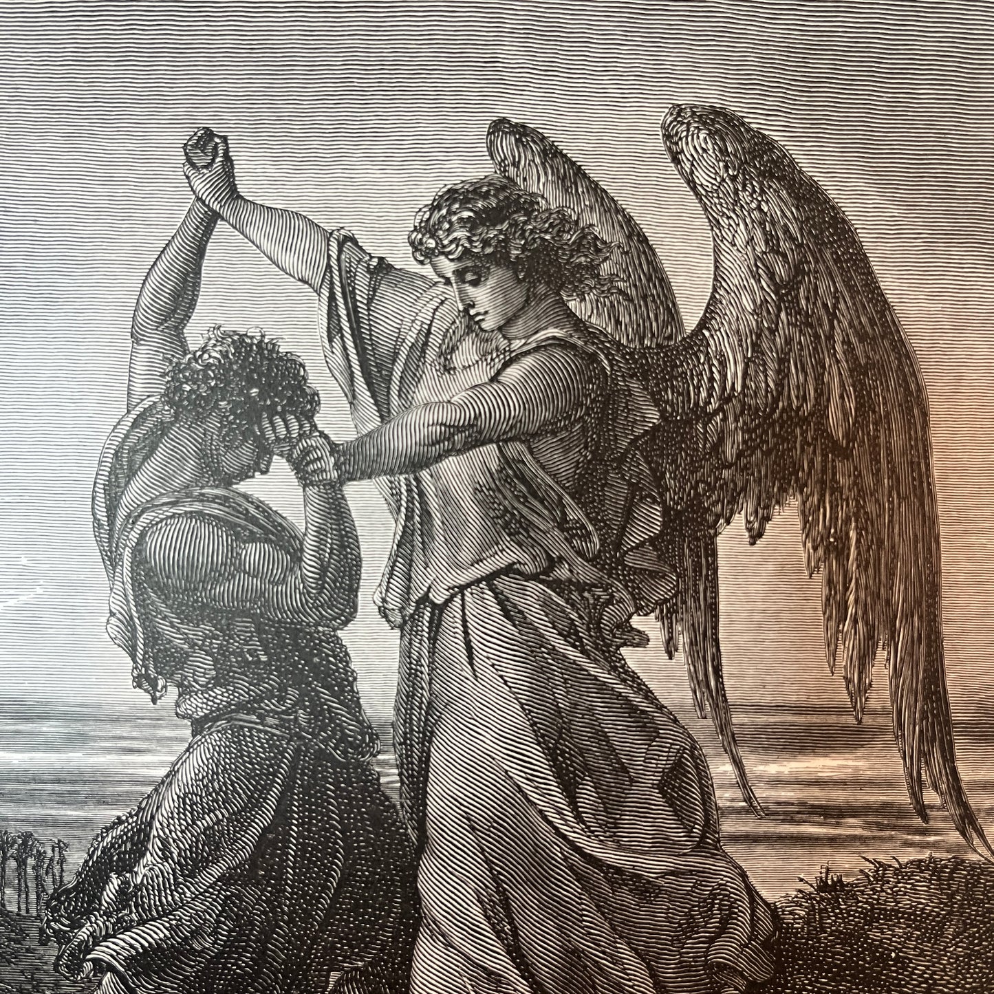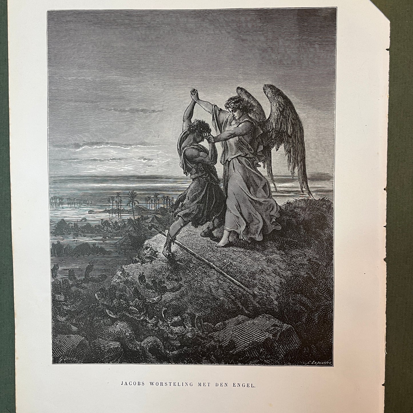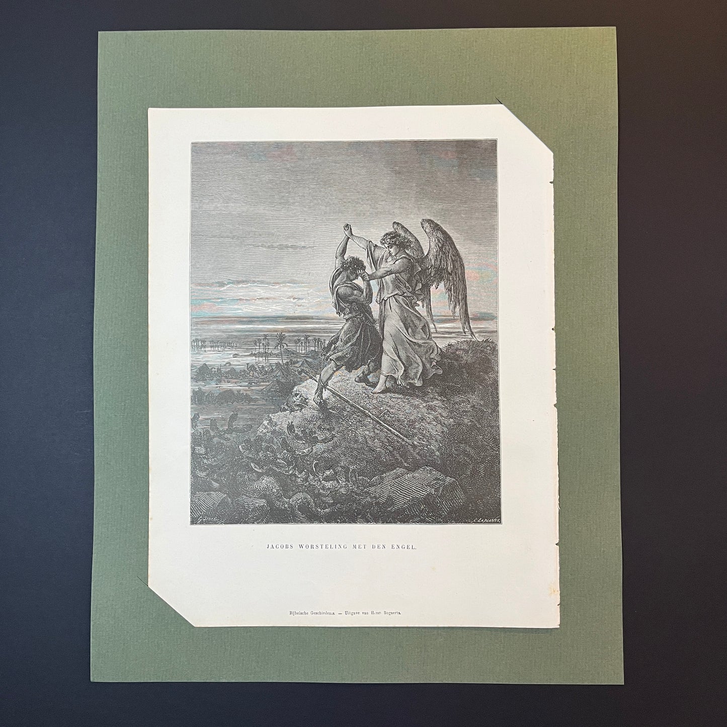 Jacobs worsteling met den engel. Originele houtgravure van Gustave Doré uit 1875.