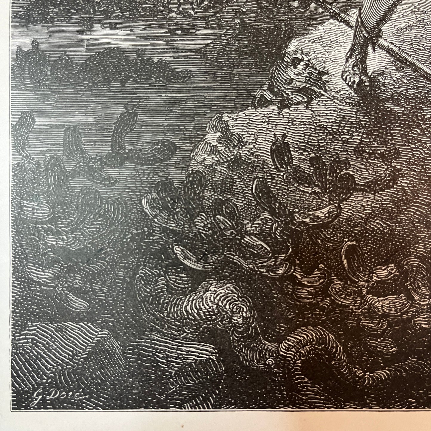 Dit is een originele houtgravure getekend en ontworpen door Gustave Doré en gegraveerd door C. Laplante. De gravure komt uit 1875 en was onderdeel van een statige Bijbel 'De Bijbelsche Geschiedenis' voor het Katholieke Nederlandsche Volk. De Bijbel is gedrukt door Henri Bogaerts (opvolger van P.N. Verhoeven), drukker en boekhandelaar van Zijn Heiligheid Paus Pius IX. De pagina heeft een afmeting van 25x32,5 cm. Je kunt ervoor kiezen om de gravure los te bestellen of in een witte of zwarte passe-partout. Beide passe-partouts hebben een witte binnenrand en hebben de afmeting 30x35 cm.