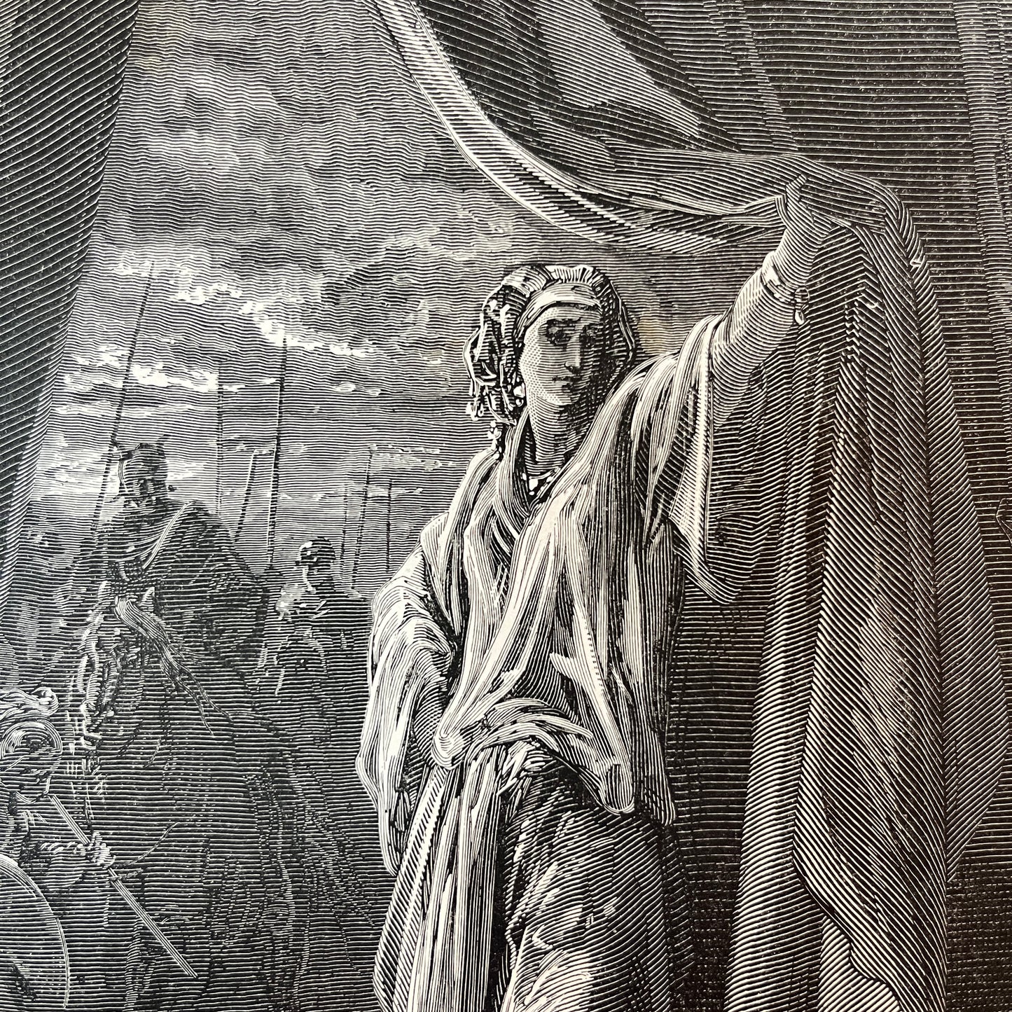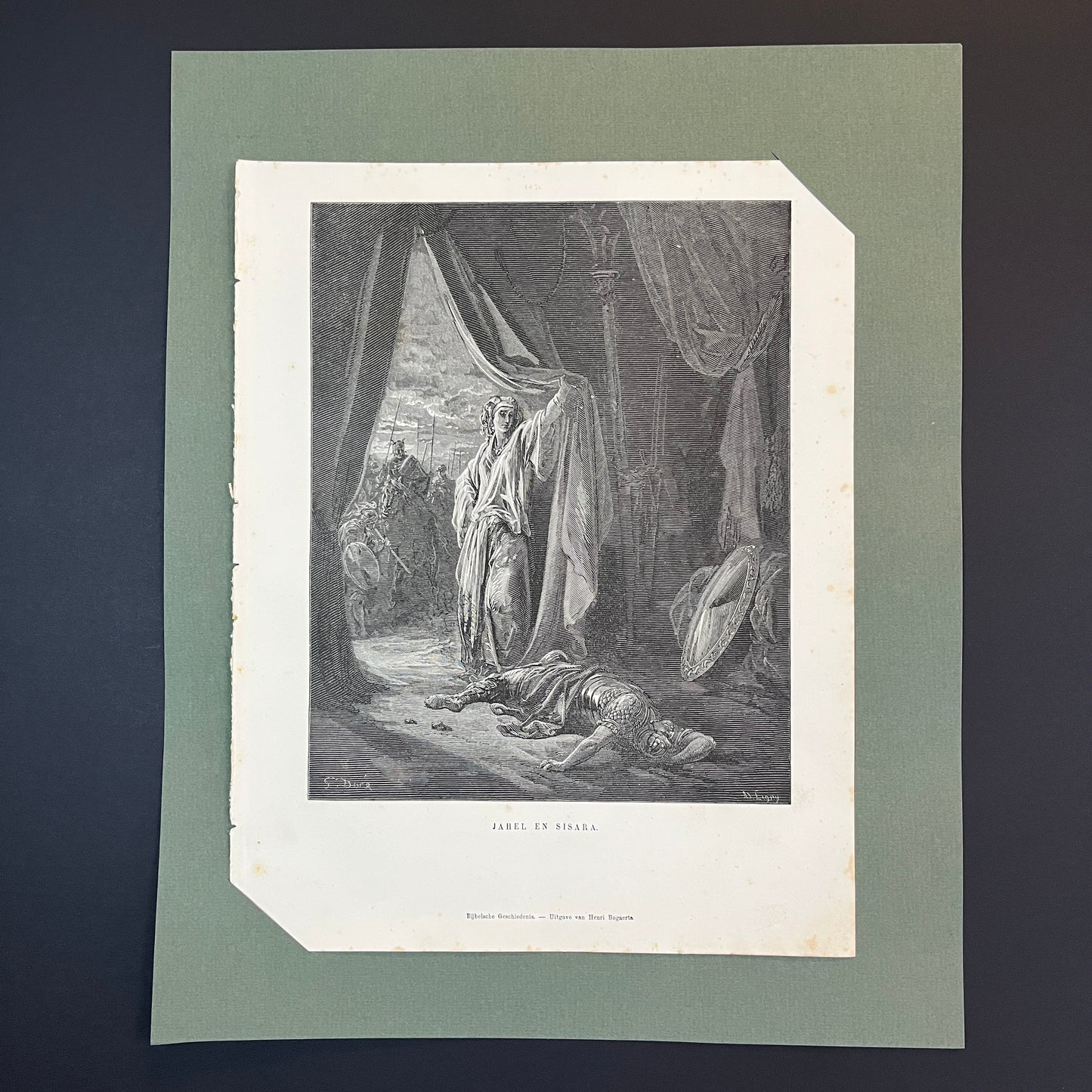 Dit is een originele houtgravure getekend en ontworpen door Gustave Doré en gegraveerd door Ad Ligny. De gravure komt uit 1875 en was onderdeel van een statige Bijbel 'De Bijbelsche Geschiedenis' voor het Katholieke Nederlandsche Volk. De Bijbel is gedrukt door Henri Bogaerts (opvolger van P.N. Verhoeven), drukker en boekhandelaar van Zijn Heiligheid Paus Pius IX. De pagina heeft een afmeting van 25x32,5 cm. Je kunt ervoor kiezen om de gravure los te bestellen of in een witte of zwarte passe-partout. Beide passe-partouts hebben een witte binnenrand en hebben de afmeting 30x35 cm.